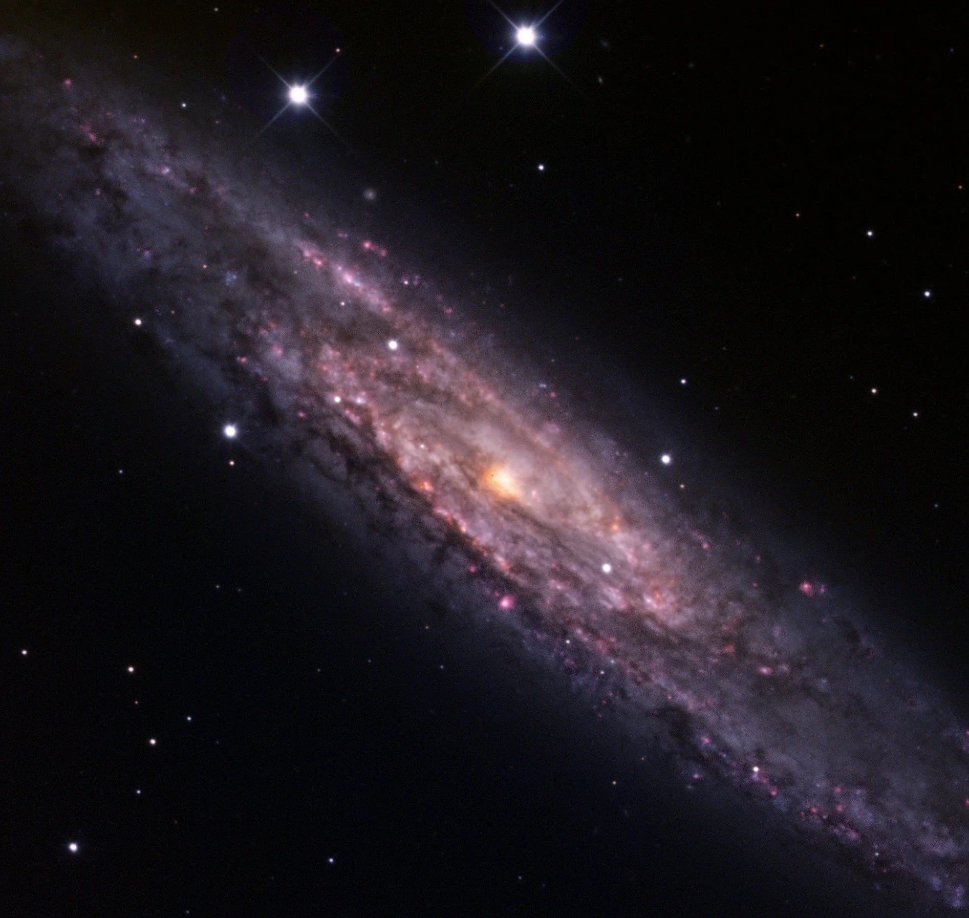 Lastly, in H, I add in 8-micron MIR data from NASA’s Spitzer spacecraft, also using the screen blend mode (and the “heat” palette). H-alpha highlights star-heated gas. Spitzer-8 highlights star-heated dust. It’s a nice addition, and makes this image a bit different from other images of NGC 253 that are out there.